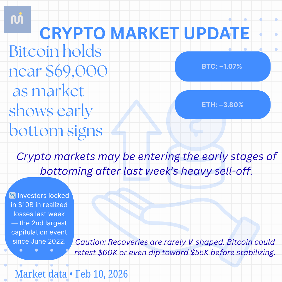 Bitcoin is hovering near $69K as analysts suggest the crypto market may be entering an early bottoming phase.
