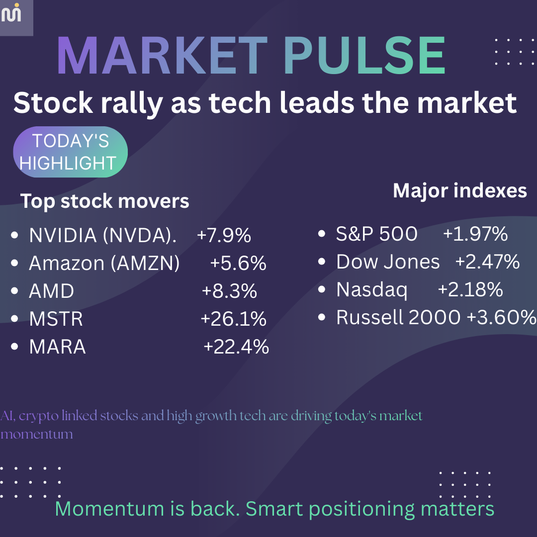 Tech, AI, and crypto stocks are leading todayβs rally.